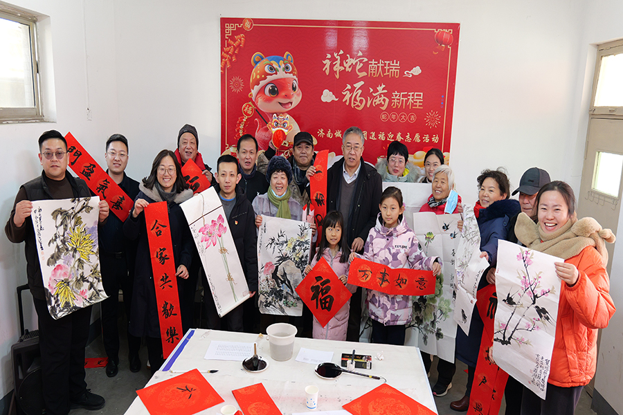 為深入貫徹中央社會工作會議精神,弘揚傳統文化,豐富社區生活,1月10日,匯通集團第一支部聯合濟南市文聯、濟南市美協共同走進千佛山西路社區、歷園新村社區開展“迎新送福”文藝惠民服務活動。 活動中,濟南市文聯副主席、濟南市美協主席李慶杰,山東省文聯委員、濟南市美協副主席兼秘書長張春艷,濟南市美協副主席張波、吳疆、李軍,濟南市書協副秘書長任清,青年作者楊淑涵、王文秀等書畫家現場揮毫潑墨,為社區群眾書寫春聯、福字,并捐贈寓意美好的書畫佳作,以筆墨為媒,將新春的祝福與溫暖傳遞給每一位社區群眾。 居民們手捧著火紅的春聯,心中滿載著“福”氣,臉上洋溢著幸福的笑容,一幕幕歲月靜好在這個瞬間凝結成時光印記,溫暖